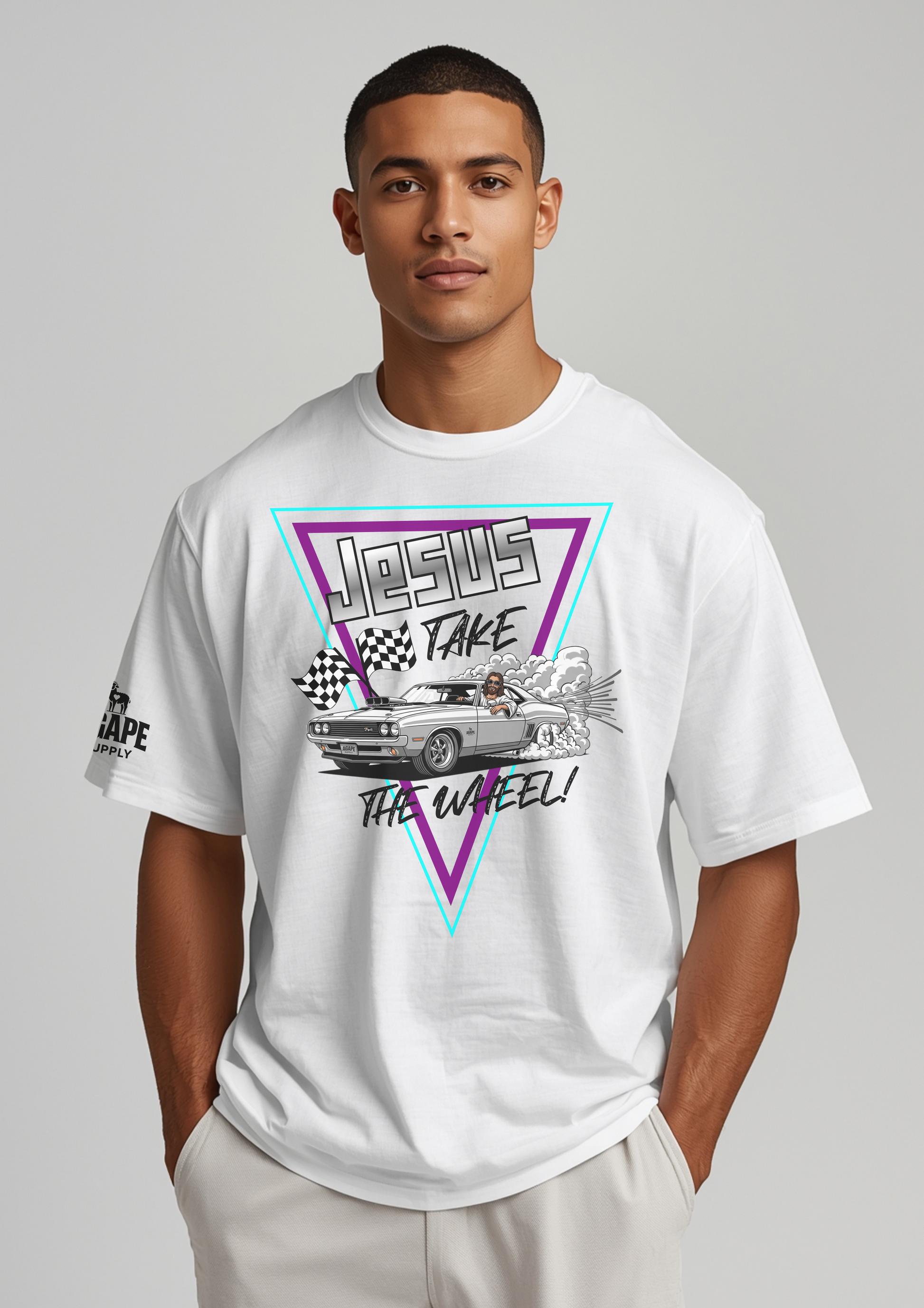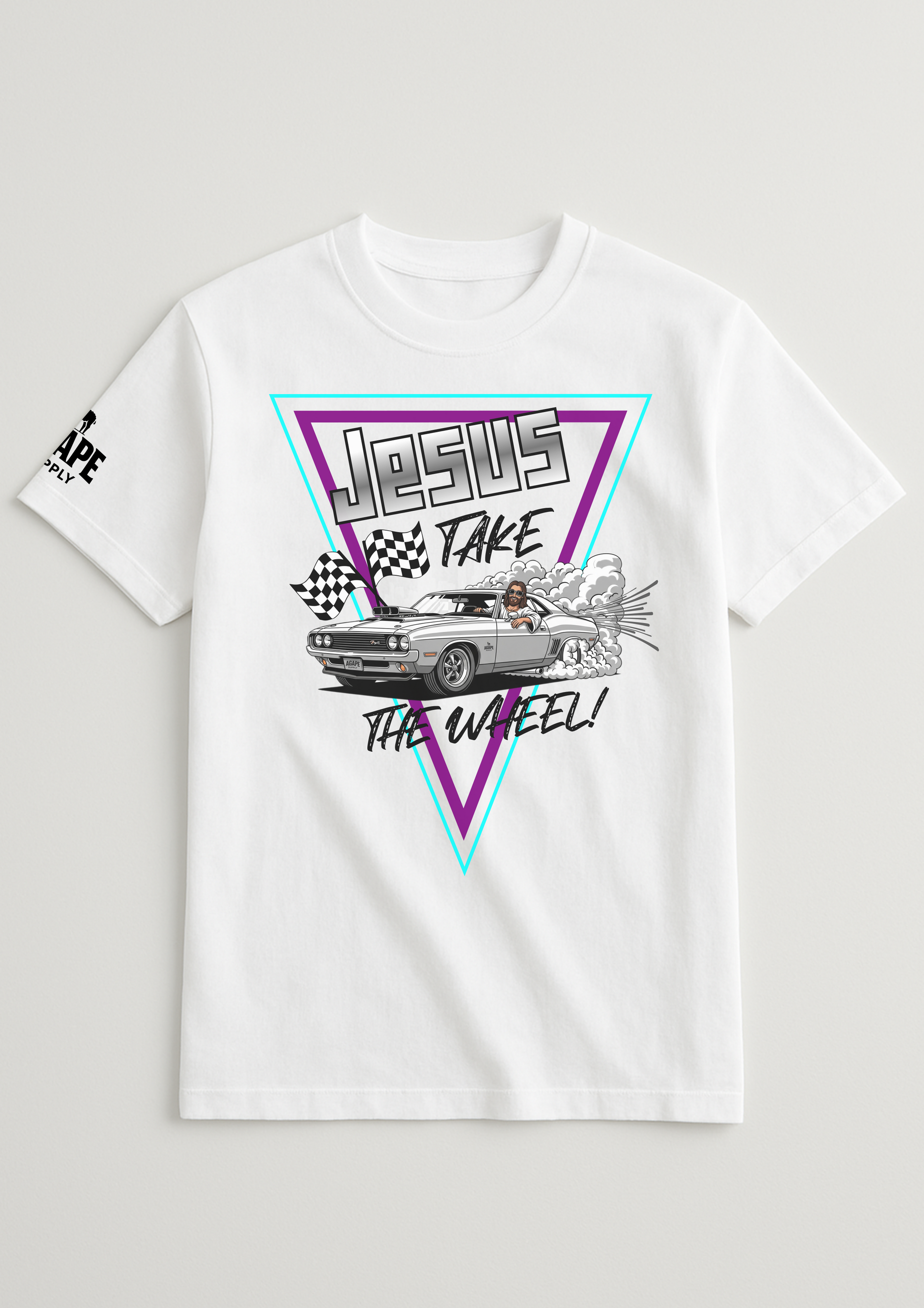 Front Design: Features a striking retro muscle car graphic with Jesus behind the wheel, framed by a neon-style triangle and racing checkered flags. The bold typography reads “Jesus Take the Wheel”, a declaration of faith and surrender that stands out wherever you go.